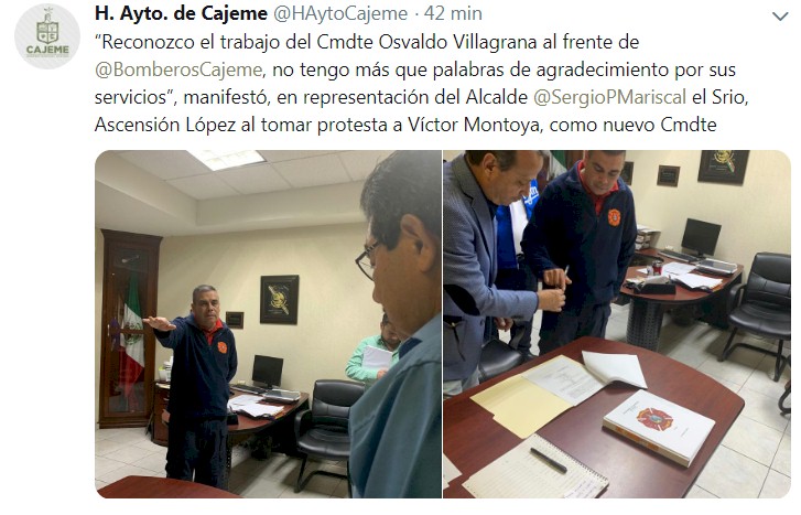 “Reconozco el trabajo del Cmdte Osvaldo Villagrana al frente de @BomberosCajeme, no tengo más que palabras de agradecimiento por sus servicios”, manifestó, en representación del Alcalde @SergioPMariscal el Srio, Ascensión López al tomar protesta a Víctor Montoya, como nuevo Cmdte