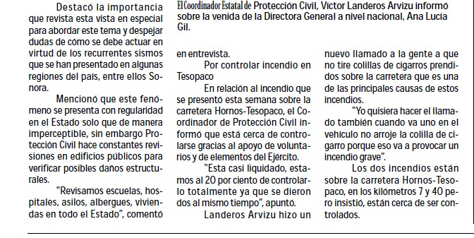 En este tema, el titular de protección Civil informó que elementos del Ejército y voluntarios trabajan en sofocar un incendio iniciado el pasado jueves a la altura del Km 140 de Hornos a Tesopaco. “Es un incendio que ya estamos atacando esperamos sofocarlo entre la noche del viernes a mañana sábado”, informó. La actual temporada de incendios suma ya 11 en Sonora con daños en aproximadamente mil 600 hectárea, una cifra por debajo del promedio de años anteriores.