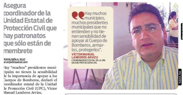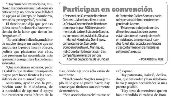 ....se está realizando en Nogales la VIII Convención Estatal de Bomberos donde se están analizando y evaluando medidas de capacitación a 400 elementos para hacer frente a situaciones de riesgo. Como lo establece la ley de Protección Civil, Víctor Landeros Arvizu funge como Secretario del Patronato Estatal de Bomberos, y en esta convención el Estado busca establecer mecanismos de actualización en el trabajo operativo de los elementos.